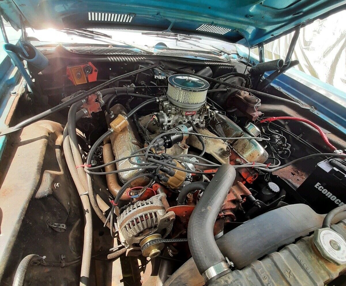 Buyers will want to focus on working on the body and interior. The blue paint is faded and there is some rust in both front fenders by the doors. There were some holes in the trunk that the seller has recently repaired. The car used to have a matching blue interior, but that has since been switched out for black. The seller has a new carpet set and headliner that the buyer can install after taking possession. There are some covers over the front bucket seats which probably means they will need work as will the dash pad.