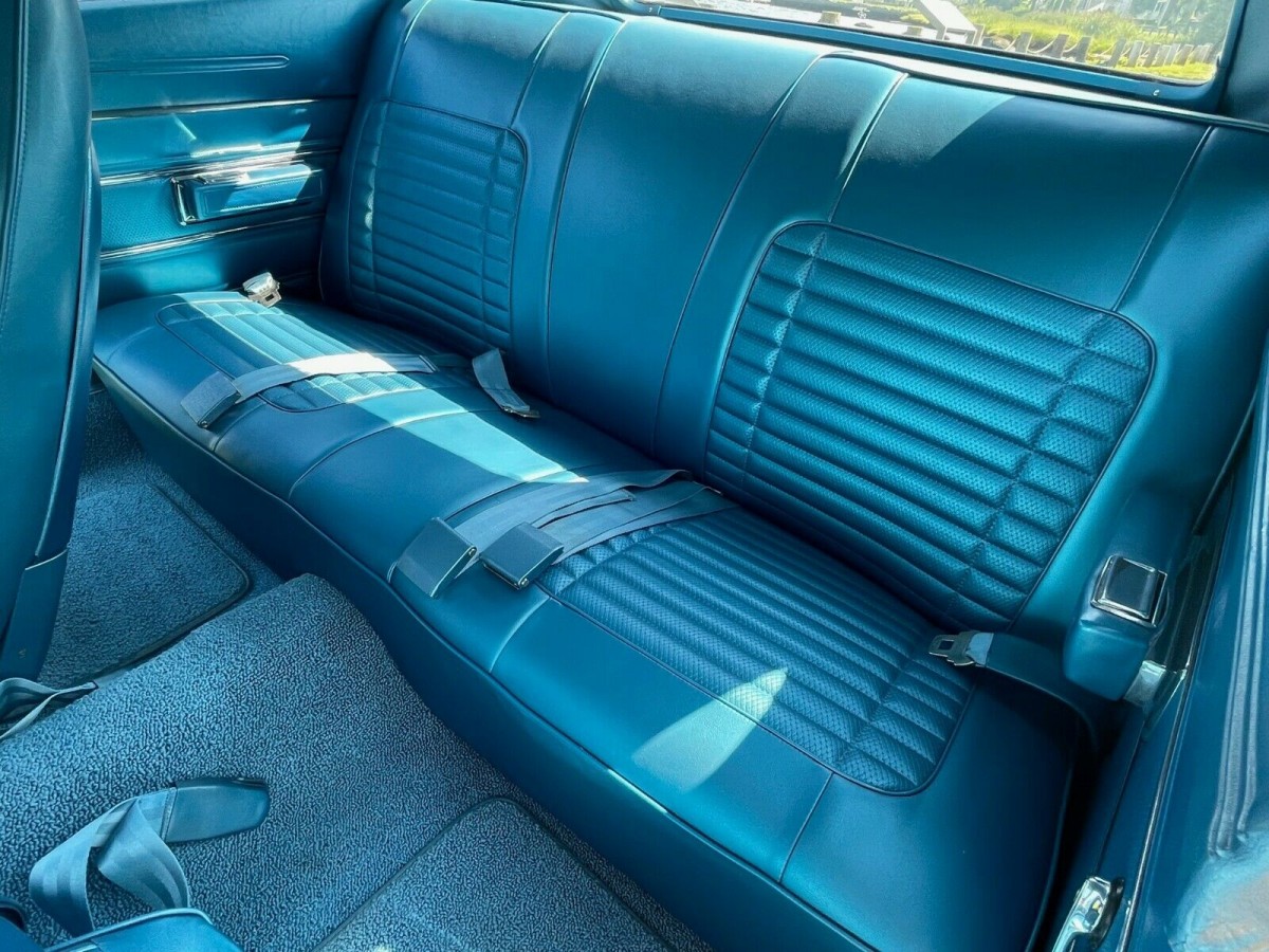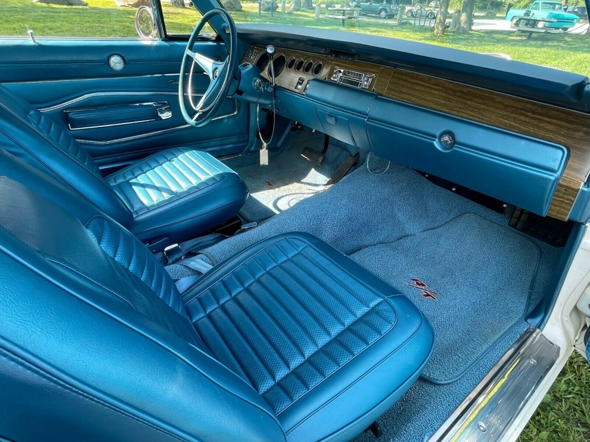 White paint with a black vinyl top and blue stripes and interior is thought to be a rare combination, according to the seller. No rust or bubbles is showing in the paint and the upholstery has no tears or rips anywhere. Just normal wear and tear. Nothing on the car appears to be wanting for anything, so this is a turnkey auto you could enjoy from the moment you took possession.