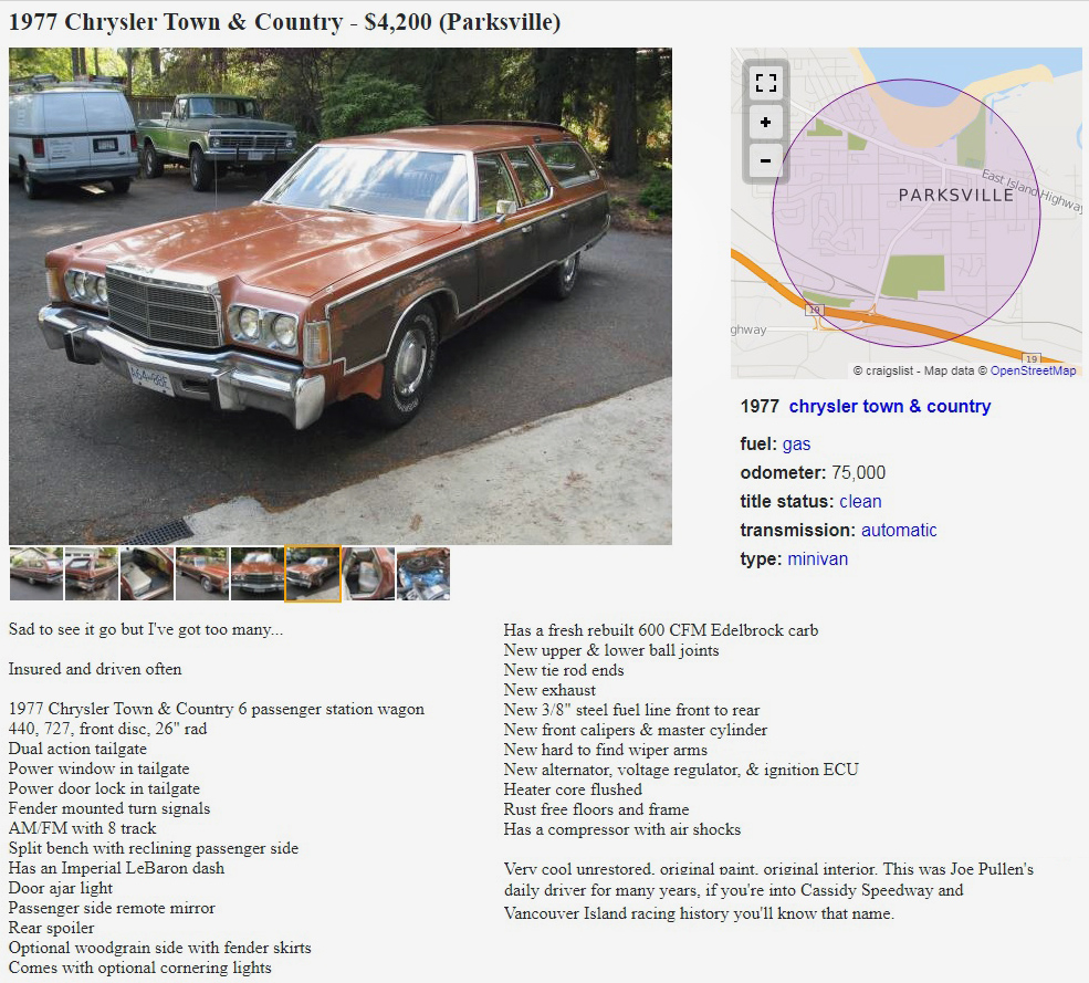 There are bigger, heavier, and longer cars that aren’t station wagons, and we’ve seen quite a few of them here on Barn Finds. At 19 feet, though, this 1977 Chrysler Town & Country Wagon is big, heavy, and long. It’s also in need of a bit of cosmetic work, as you can see. It’s posted here on craigslist in Parksville, British Columbia, Canada, and the seller is asking $4,200 ($3,000 U.S. dollars). Here is the original listing, and thanks to Curvette for the tip!