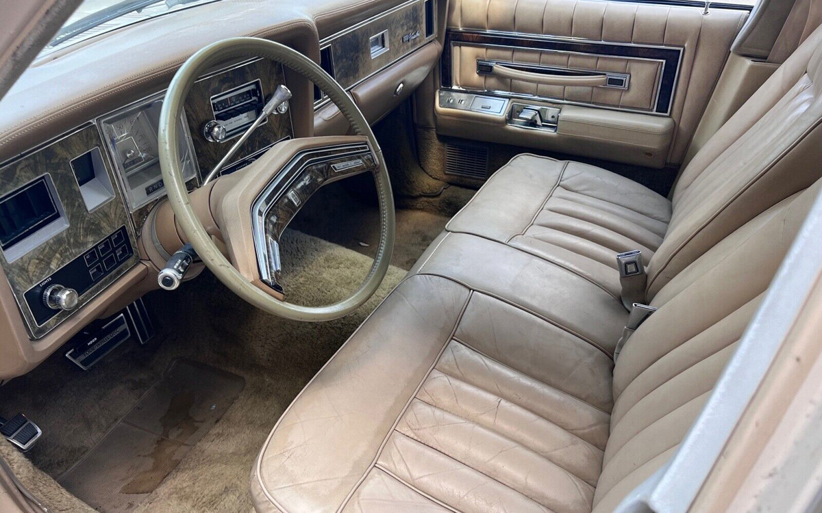 The optional Champaign leather seats appear to be in good condition with the usual cracking and aged look. The seller says that they have been “refinished”, although I’m not sure what that means. Literally, as in dyed or spray-painted like you’d see in a YouTube video? The back seat looks great as they almost always do. The seller says that this car has a new headliner, the vinyl top has some splitting, and they mention some paint issues and there is just one rust spot.