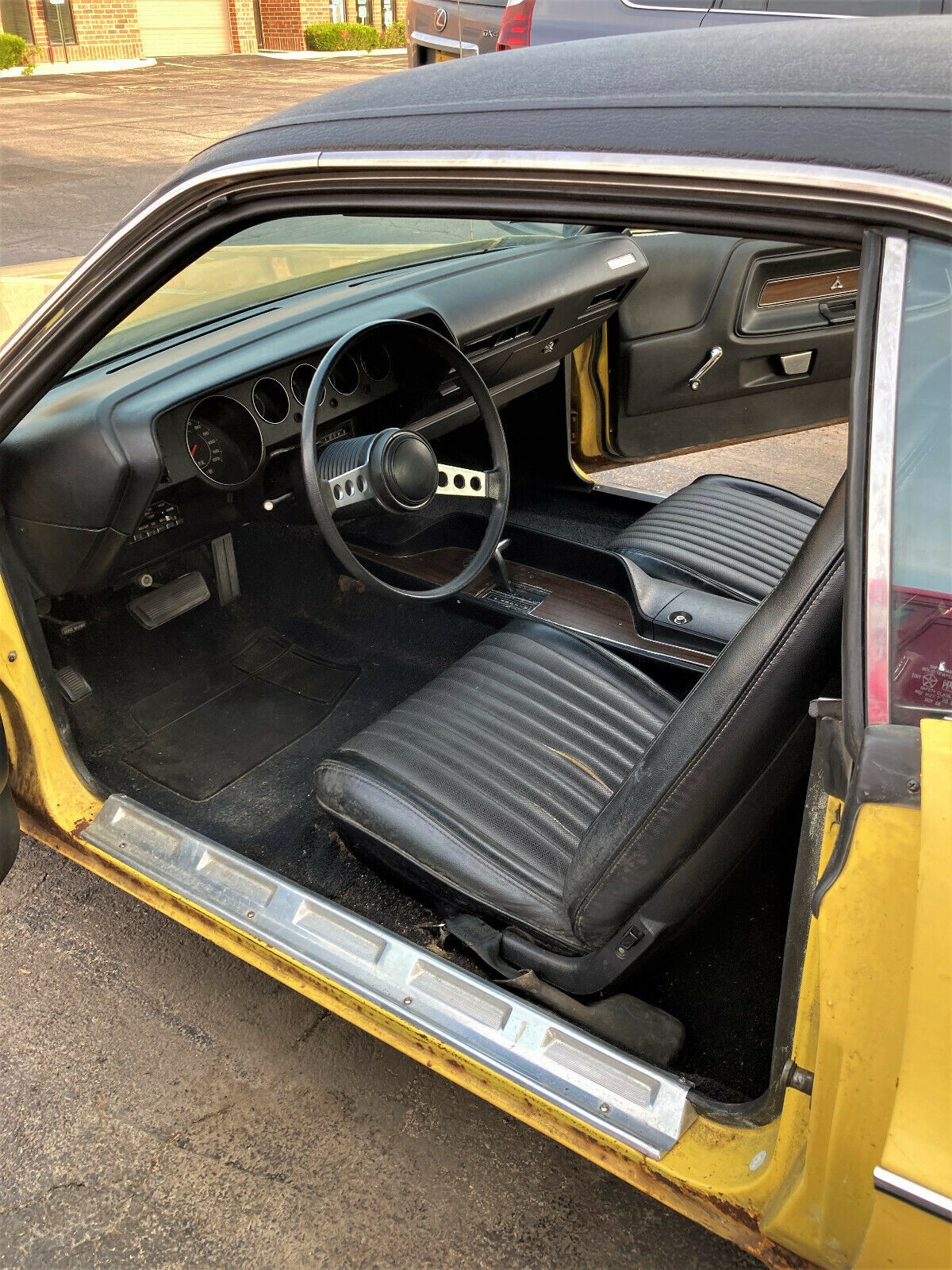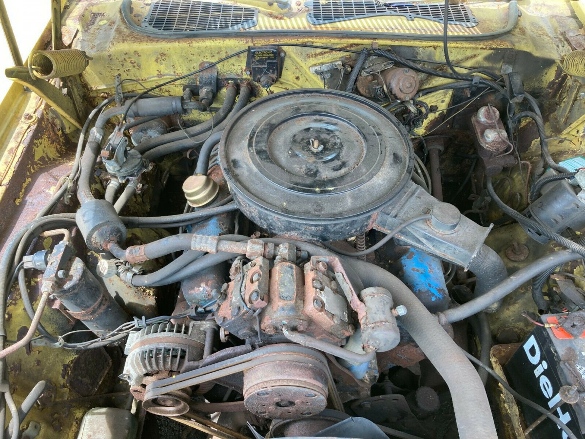 Challenger sales dropped by two-thirds from 1970-72. 22,919 of the pony cars were built in ’72, of which 15,175 were 318 V8s like the seller’s car. This was previously a one-owner automobile and – as she got older – that owner lost her confidence as a driver, so it has been dormant the past few years. The paint looks to be Top Banana and while it’s the original color, it may not be the original application. The vinyl top may be the best part on the exterior, not showing any wear or apparent rust bubbling up from below. There’s plenty of rust in the exterior sheet metal, but we’re told most of the undercarriage has held up, perhaps thanks to factory undercoating.