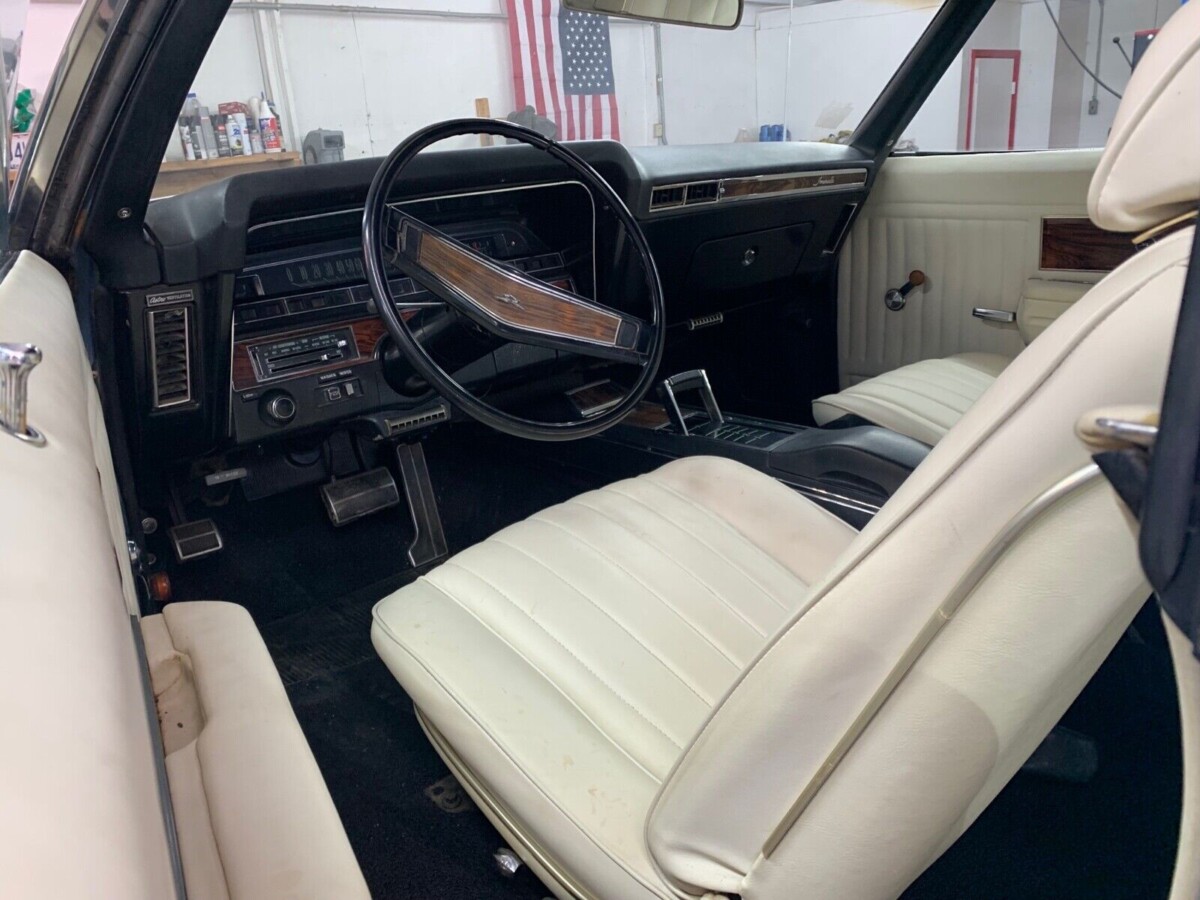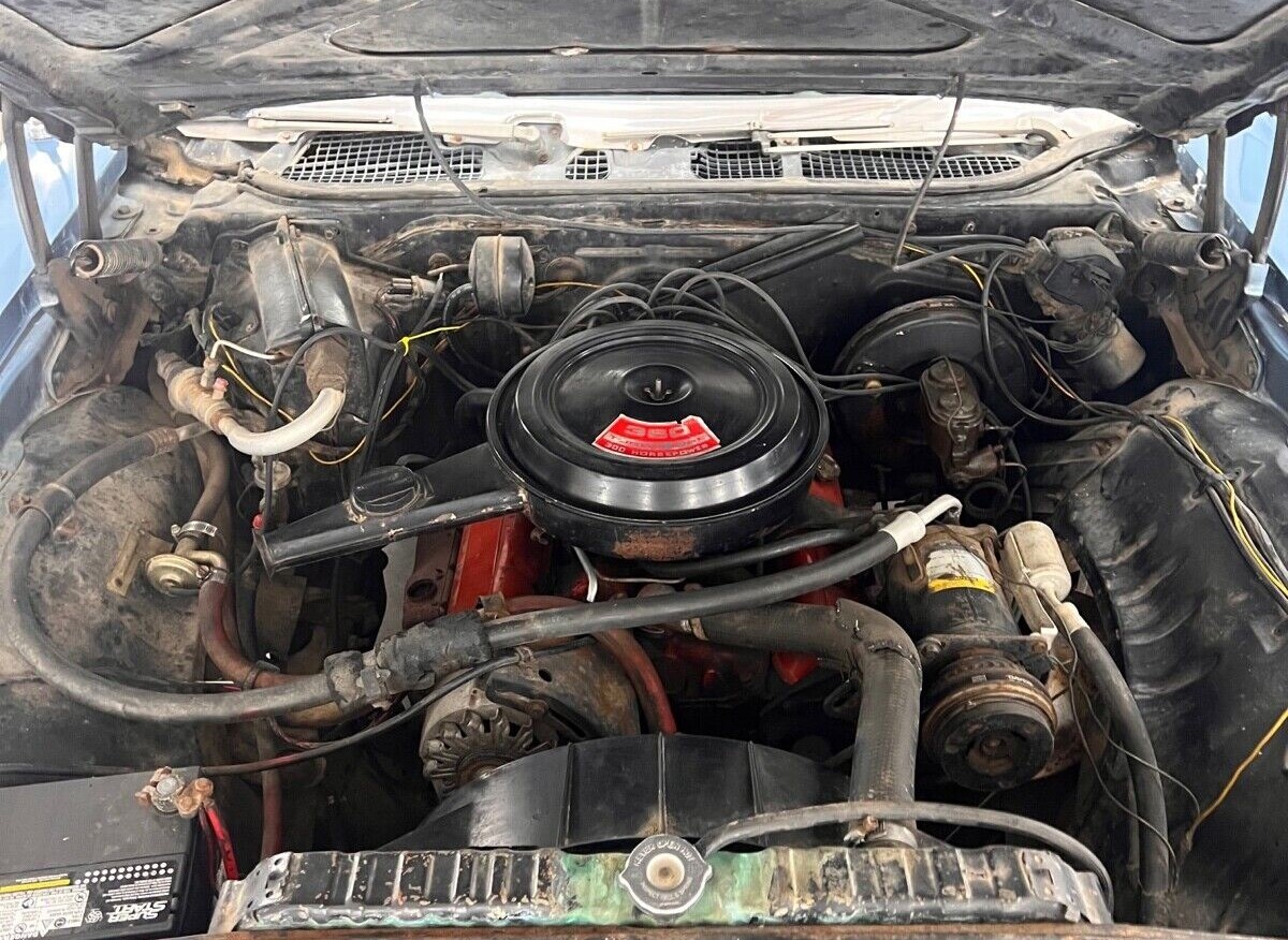 The Glacier Blue finish looks good on the exterior, with just a few flaws which include some bubbling in a couple of the extremities. The undercarriage looks crusty, but this is a 54-year-old auto. The Parchment vinyl top seems no worse for the wear and the mostly matching interior with bucket seats is said to be in “driver condition” meaning nice but not great. The car sports a set of rear fender skirts, which were on their way out by the late 1960s as a styling technique. They make an already large car look even bigger. Would you leave them on or take them off?