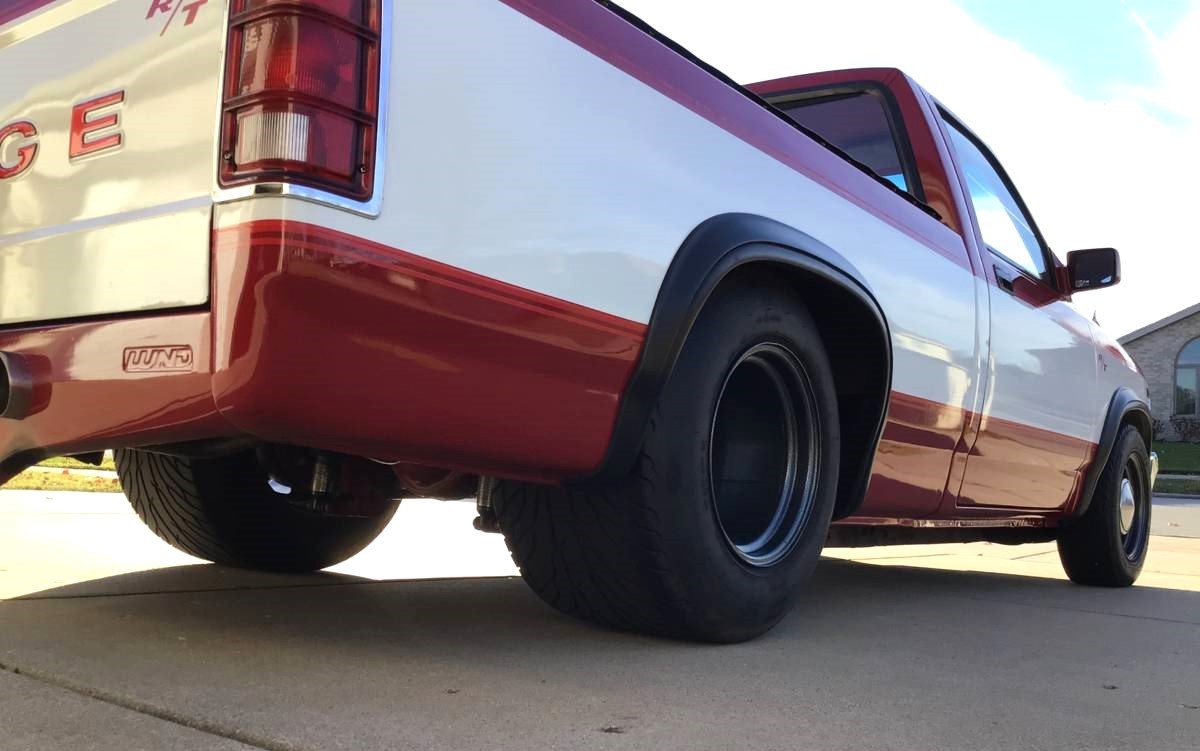 We’re told this pickup has a 5.2-liter V8 which works out to 318 cubic inches. Is this motor that engine on steroids or did they drop in something more potent than anything ever to come out of the plant in Warren, Michigan where the Dakota was built? Whatever the case, it’s a fire-breather now and the truck looks to have been lowered and the rear suspension modified to accept the really wide rear tires.