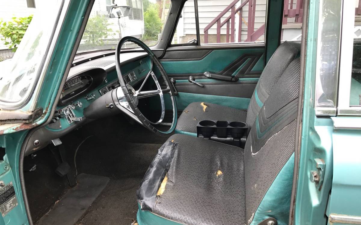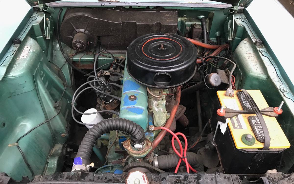 This car looks like it just rolled off the showroom floor, at least in the first two photos. The paint is maybe in need of a buff but I don’t see one single flaw in this car at all so far. And, that Aqua Mist Metallic paint is perfect for this era. The seller says that this car has only 48,309 miles on it so maybe that’s why it looks so good. This is the top of the line Custom model, too. The Deluxe and Super would have been the base and mid-level trim models under the Custom. The Custom added full wheel covers, rear vent windows, carpet, two-tone steering wheel, a glove box light, and a clock.