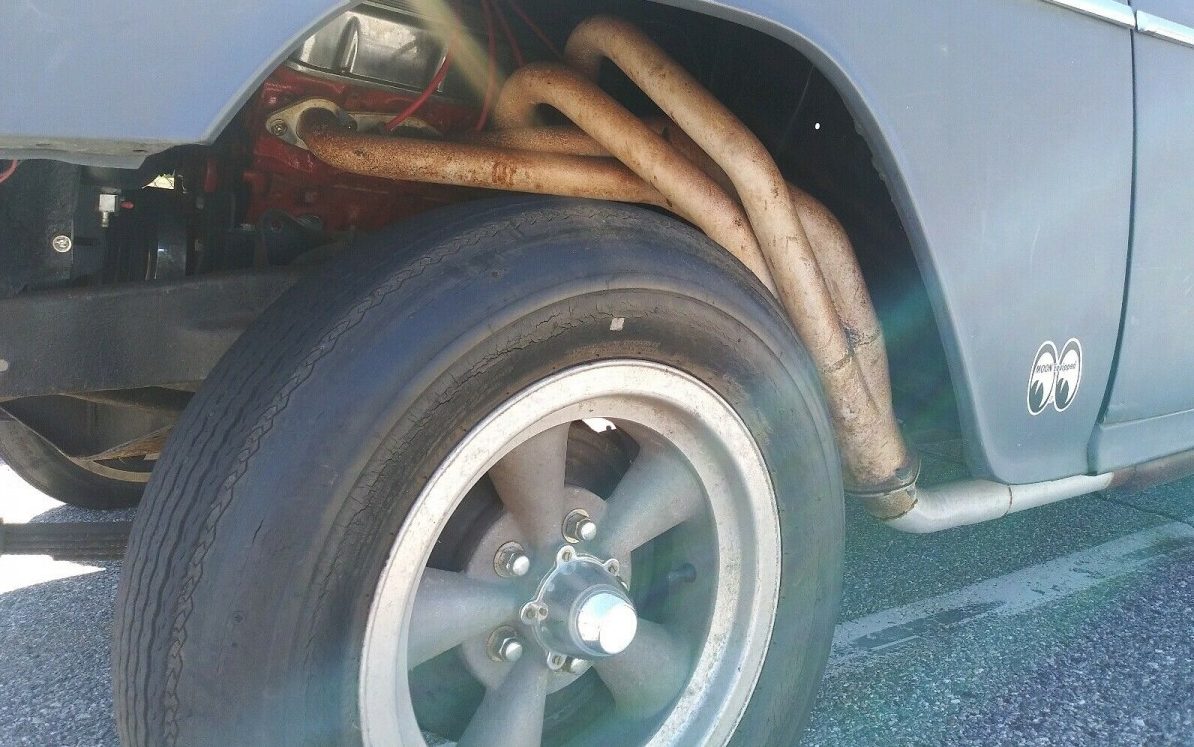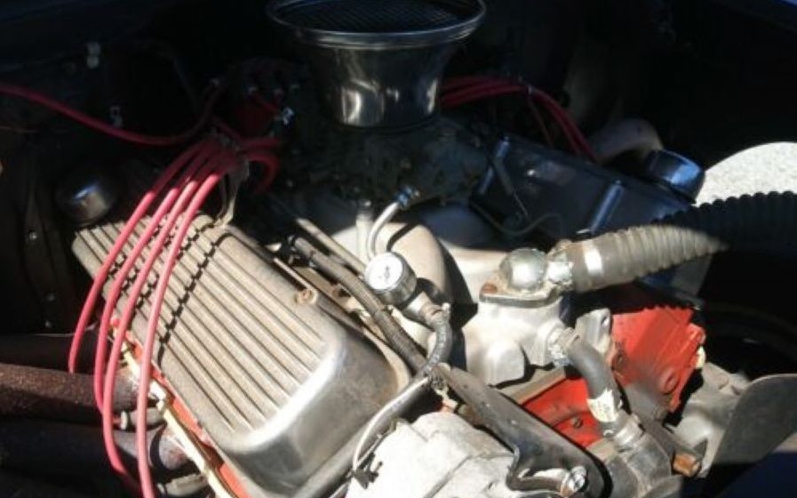 The interior of this subject car is missing one of the coolest features that I remember from the movie car and that’s the sliding, plexiglass side windows. Being a hardtop with frameless door windows wouldn’t allow such a setup here so it has to make-do otherwise. The interior’s image is limited and the seller states, ” NEEDS INTERIOR WORK” but does not elaborate beyond that. From what little can be spied, the interior looks fair though the steering column is out of a late model, ignition lock equipped, GM car and there is wiring hanging about underneath the dash, connected to something or another. The original stainless instrument panel shows well, though it has had a gauge implanted to the right of the speedo and the heater/defroster control head looks to have vacated its levers (you don’t need a heater on a hot rod, right?)
