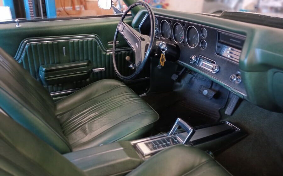 Inside is the standard Chevelle SS issue in its reserved and understated presentation. Optional bucket seats and a center console are in place, along with what appears to be an eight-track Delco radio, but that’s about it. Curiously, there were no engine gauges or tachometer originally specified, just warning lights. The vinyl upholstery is said to be original and it presents just as it should.