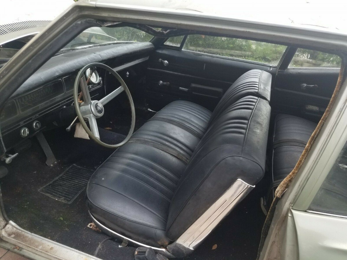 The exterior paint looks decent but the moon caps and the white wall tires need to go! There is some rust on the roof and around the rear window. The glass looks good and the seller provides pictures of the bottom of the car. The dash appears to have a crack in it but it looks like the interior just needs to be cleaned up. At 214.7 inches long, this car is roomy and is said to be equipped with its original 12 bolt rear end. With the proper work, it should be able to get back on the road.