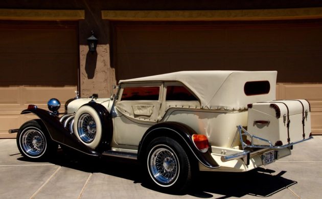 Excalibur was the brainchild of Brooks Stevens, who was tasked by Studebaker in 1963 to build a show-stopping concept based on a Lark chassis. From there, the project “grew legs,” with the first Excalibur hitting the market later that year. An updated Series II appeared in 1970, with the Series III following in 1975. Buyers could choose between a Roadster and a Phaeton version, with our feature car being the latter. The first owner ordered it in an eye-catching combination of Ivory and Brown, with a matching soft-top and covers for the spare wheels. The seller is candid about the condition, suggesting that buyers should consider it a driver-grade survivor, rather than a trailer queen. There are no glaring cosmetic shortcomings, with the paint holding a healthy shine, the top fitting as tight as a drum, and the trim sparkling impressively. Excalibur dropped the body onto a ladder-type steel chassis, and with this car located in Arizona, I wouldn’t expect to find any rust beyond possible dry surface corrosion. As befits a neoclassic, this Phaeton rolls on wire wheels fitted with narrow whitewalls.