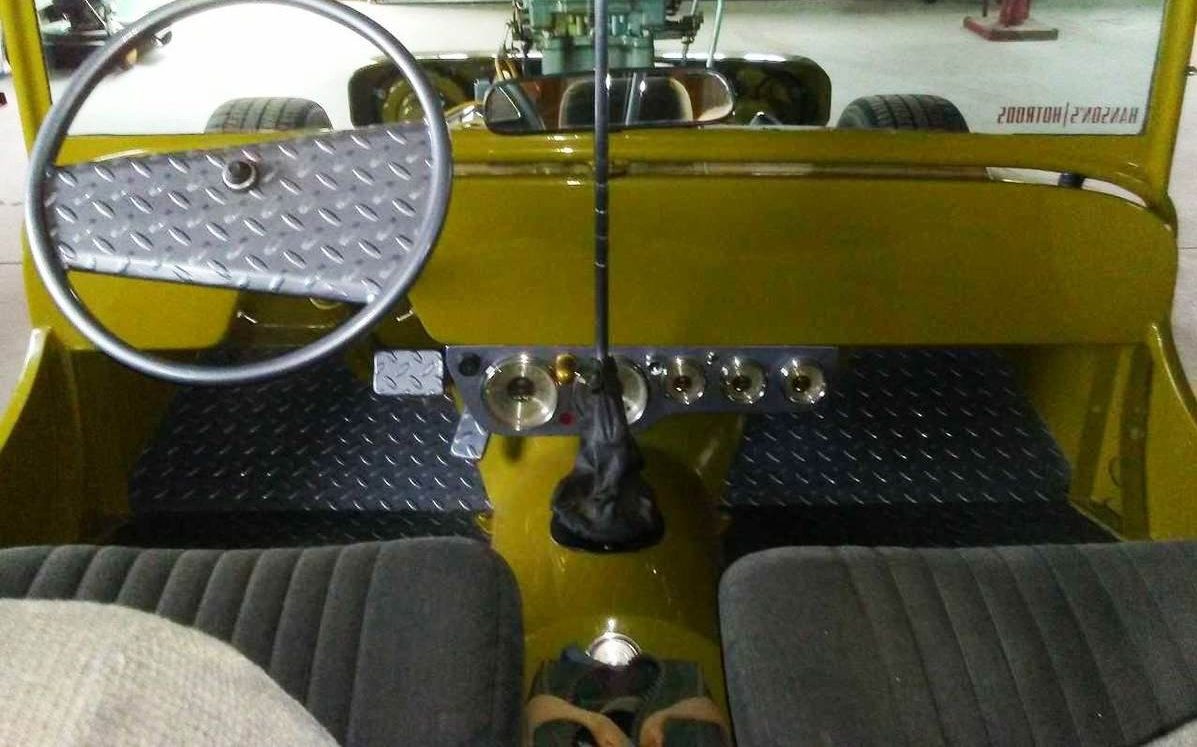 A diamond plate and tube steel theme extends to the asymmetrical steering wheel. That and the low-mounted retro gauges emphasize form over function. The flat dashboard compliments the equally spartan listing. Plush-looking seats promise more comfort that the originals, and a towering shift lever urges celebration of the vehicle’s automatic transmission. Operating a manual transmission with an eight-foot long shifter would quickly test your commitment to fashion.