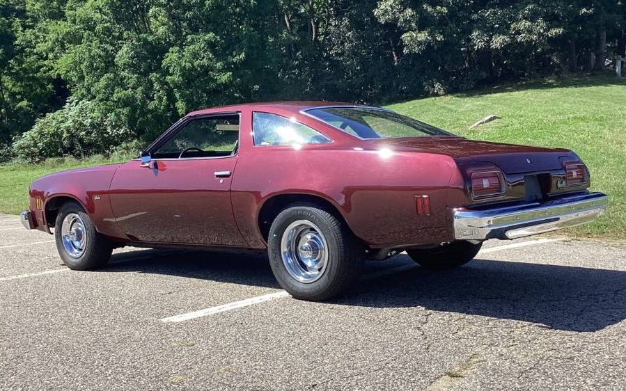 I had this in the 1975, 350 automatic version. It was red, vinyl top delete as this one with a bench seat. I put duals, headers and installed a shift kit and the car was pretty quick for the day. Mine had 8″ Vette rallies all around, but I like the offest look with the 7″‘s on the front of this. The stance gives it a menacing look and let’s people know there may be something going on inside!