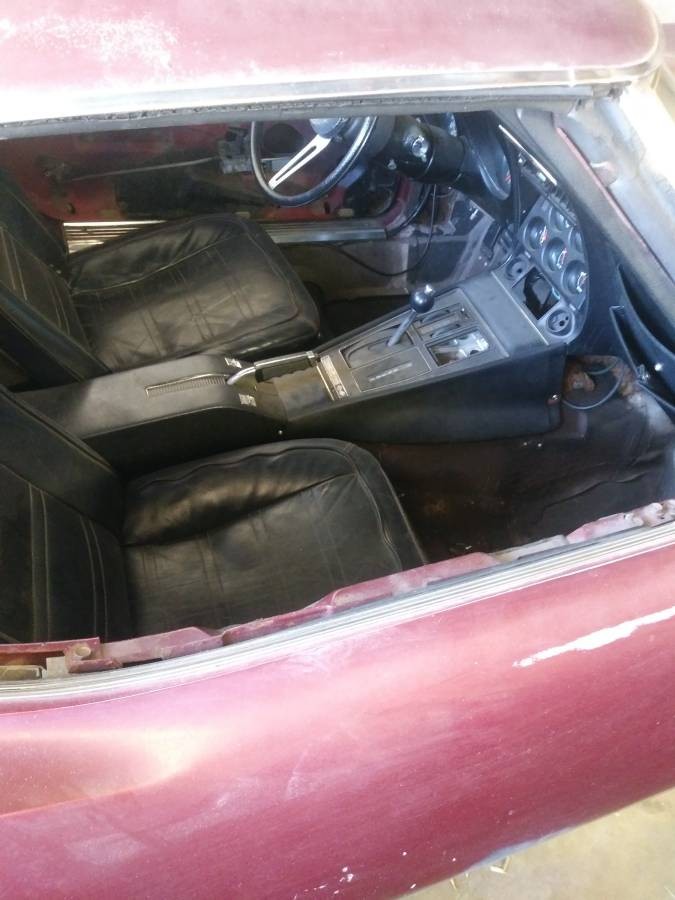 This Sting Ray is a running project with a reported 68,000 miles on the odometer. We’re told it’s a good runner, so perhaps most of the attention needs are probably with how it looks. The burgundy paint is mostly gone on the back half of the car (maybe from exposure to the elements). And the rear Tupperware bumper is wearing a decent coat of grey primer. The black leather seats are said to be good, but the door panels have been removed and will need replacements. The buyer will also need to order a new carpet set.