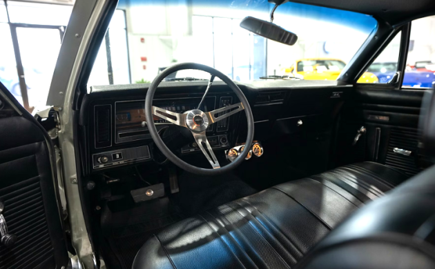 This Chevy looks like a grandma’s car until you open the hood. The Pewter Metallic paint looks great, and we assume that it’s the original color. The black vinyl upholstery looks as though no one has sat inside this beauty, although the steering wheel isn’t stock. We’re told the original suspension was reused, so the car has not been beefed up to handle the heavier weight over the front wheels. But you have extra gauges on the dash to help you keep track of the action. The only flaw the seller acknowledges is that one of the radio knobs is missing (surely you can find one online).