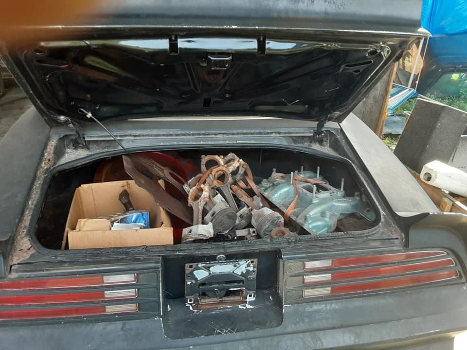 This is a numbers-matching Trans Am, equipped with a 455ci V8 and a 4-speed manual transmission. We don’t get any shots of the engine bay, but this one of the trunk seems to confirm the owner’s claim that the engine has been disassembled. We can see the intake, pistons, and the rods, all floating around in there. The shifter for the 4-speed wasn’t poking through the floor in the interior shot, which suggests that both the engine and transmission have been removed. The amount of corrosion that is present on the pistons and rods could indicate that the engine has been dismantled for quite some time, and that, once again, the Pontiac has been exposed to a significant amount of moisture. I would like to see the engine block because, with the corrosion that we can see here, I’m wondering whether the cylinder bores are in the same sort of shape. If I look into my crystal ball I can foresee plenty of work in the future for the next owner of this car.