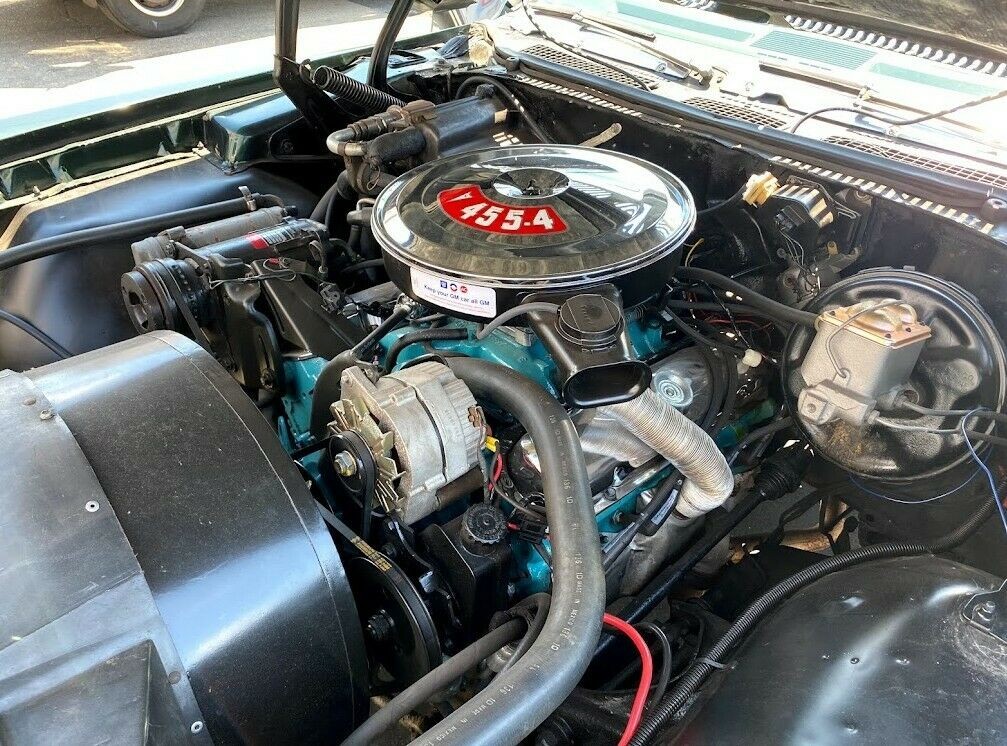 While other car manufacturers were downsizing their engines and horsepower ratings, Pontiac continued to offer the 455 cubic inch V8 engine through 1976. This engine was called the Y Code 455 engine which was a D port head 4 barrel engine rated at 300 gross horsepower. The following year, this engine was rated at 250 net horsepower. In contrast, Pontiac offered a 455 cubic inch V8 engine in the Pontiac Formula, GTO, and Trans Am that was called the HO455 and was a round port head engine rated at 310 horsepower. The engine is said to run great and has recently had a new exhaust, water pump, radiator, alternator, hoses, belts, and carburetor installed.