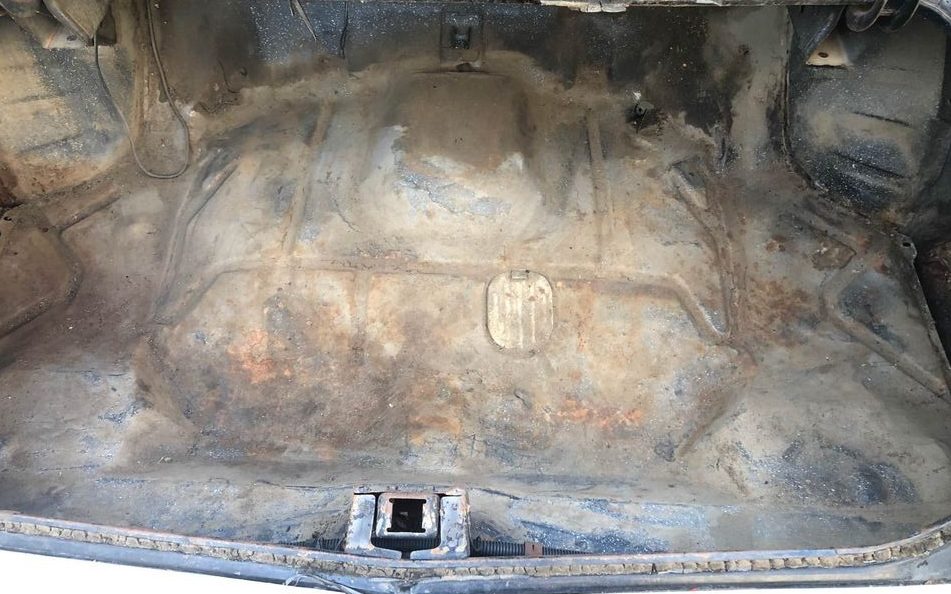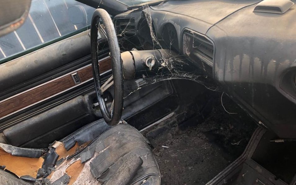 The interior looks like it’s done up for a Halloween party with its cobwebs but those are probably real as opposed to originating in a spray can. Admittedly, the image isn’t very comprehensive but it shows a trashed seat, split dash covering, and either greatly deteriorated or missing carpet. A good cleaning would help as a starting point, but it’s going to take more than that to create a presentable environment.