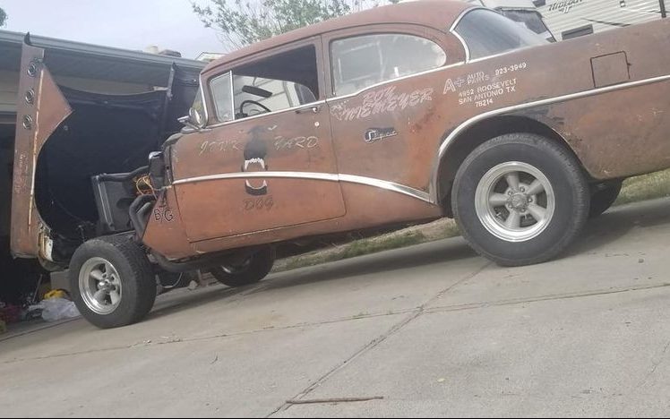 You have to love the concept! A great cars ‘n coffee cruiser. Those faded out graphics in the sides (Junkyard Dog) indicate a former home in San Antone, Texas (maybe some genuine history there?). Too much metal for a real competitive gasser (B gas at a minimum) bur maybe a cool ‘Run whatcha brung’ entry. Street legal may be possible to do evening cruises, , but you’d have to seriously lower the headlight beams…