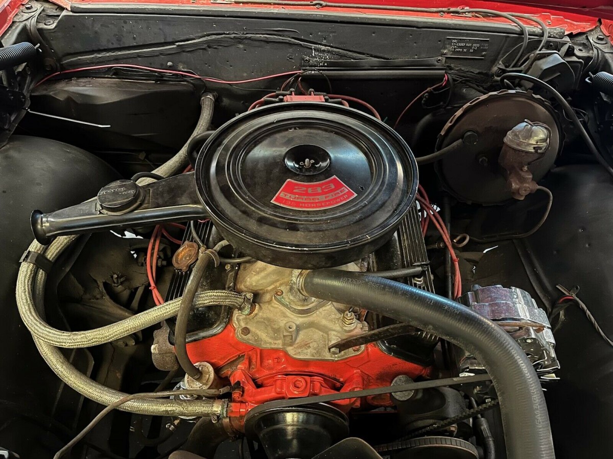 The fender callouts identify this as having a 283. Aside from the poorly applied/weird color wheel wrap on a later model steering wheel, and the fact that the exhaust should be tucked up higher, this is a very nice one! I’d replace the steering wheel, and the non OEM brake pedal as well. GLWTA!! :-)