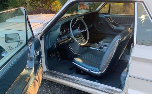 The interior is photographed from a distance, so the details are not readily observable. What can be seen is a typical blue vinyl upholstered environment, replete with bucket seats and a center console. Regardless, it all appears to be in fine nick, with the exception of the driver’s door armrest. One nice interior feature is the standard equipment “Swing Away” steering wheel/column, which shifts horizontally for easier ingress/egress to the driver’s seat. Of note, A/C was an option, and I can’t spot the obvious compressor under the hood, so I’d run with the assumption that this T-Bird relies on “260” air conditioning.