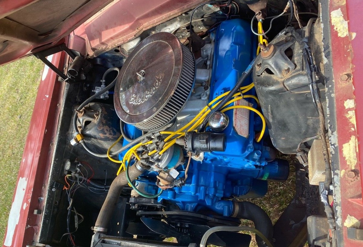 My guess somebody was racing this at one point by the hole in the missing backup light on passenger side. Electric shut-off switch, no? Probably with a different motor though. That 460 does look to be a quick drop in. With the fordish blue over spray on everything I can’t imagine somebody having done any work on the motor outside of the expert paint. Does have an aftermarket intake on it though …