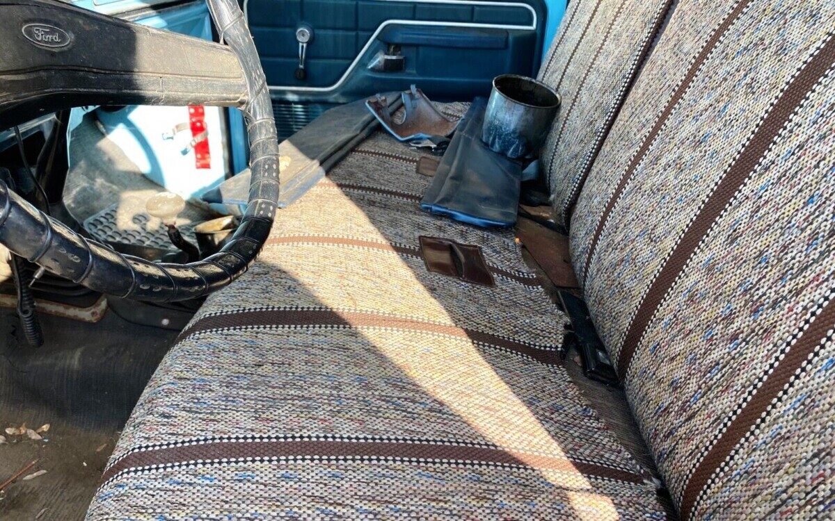 The classic “Western Blanket” seat cover no doubt hides torn vinyl upholstery. The Ranger package adds fancier trim inside and out. My Grandfather had a Bahama Blue Bicentennial Edition F-Series, so this cab shot (such as it is) brings back the memories. He explained the concept of a four-barrel carburetor having small primaries and large secondaries, punctuating the lesson by slamming the gas pedal to the floor so I could feel the difference. Good times.