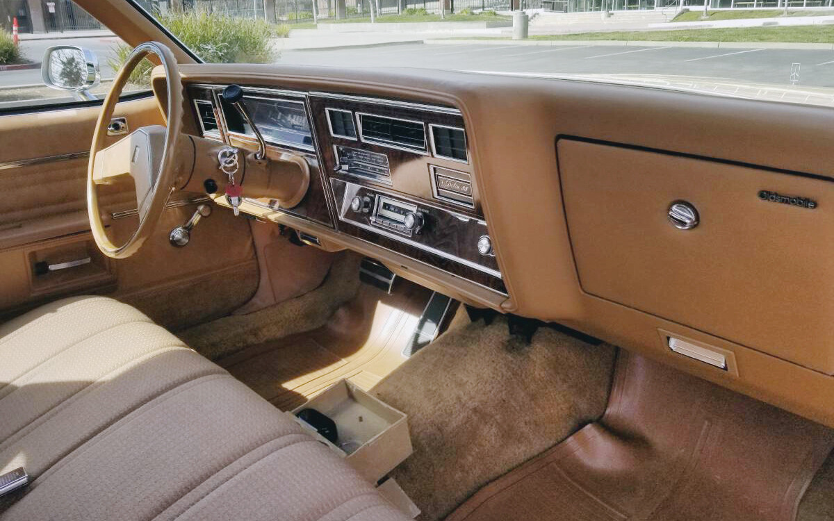 I bought a ’78 88 Royale for $600 as an all season driver to keep my ’84 Cutlass Brougham for summer and car shows. Came with load of repair receipts including new transmission. Had a 350 and p/w, p/l, p/s, p/trunk, a/c. I added factory cruise, delay wipers, blower rear defogger. Found a decent dash I redyed to match and some shag carpet from a Caddy de’Elegance.