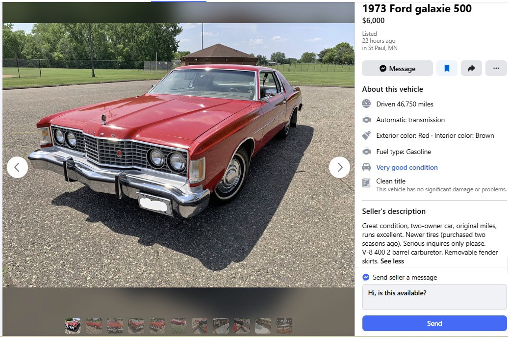 Here’s the engine, and it sure looks comfortable. Sorry, I couldn’t resist, I mean, it’s not that hard to pop the hood and get a quick photo, but Craigslist and Facebook Marketplace sellers are notorious for not showing engine photos. This one is said to be Ford’s 400-cu.in. OHV V8, which would have had 171 horsepower and 314 lb-ft of torque when new. A 351 was standard. The transmission should be a three-speed automatic sending power to the rear wheels, and speaking of the wheels, they’re just two years old, and this car runs “excellent.” Hagerty is at $9,100 for a #3 good-condition car and $13,600 for a #2 excellent car, so this appears to be a steal at just $6,000. Any thoughts on this one, as far as this being a factory Galaxie 500 color according to the ’73 Ford Colors brochure, or the asking price?