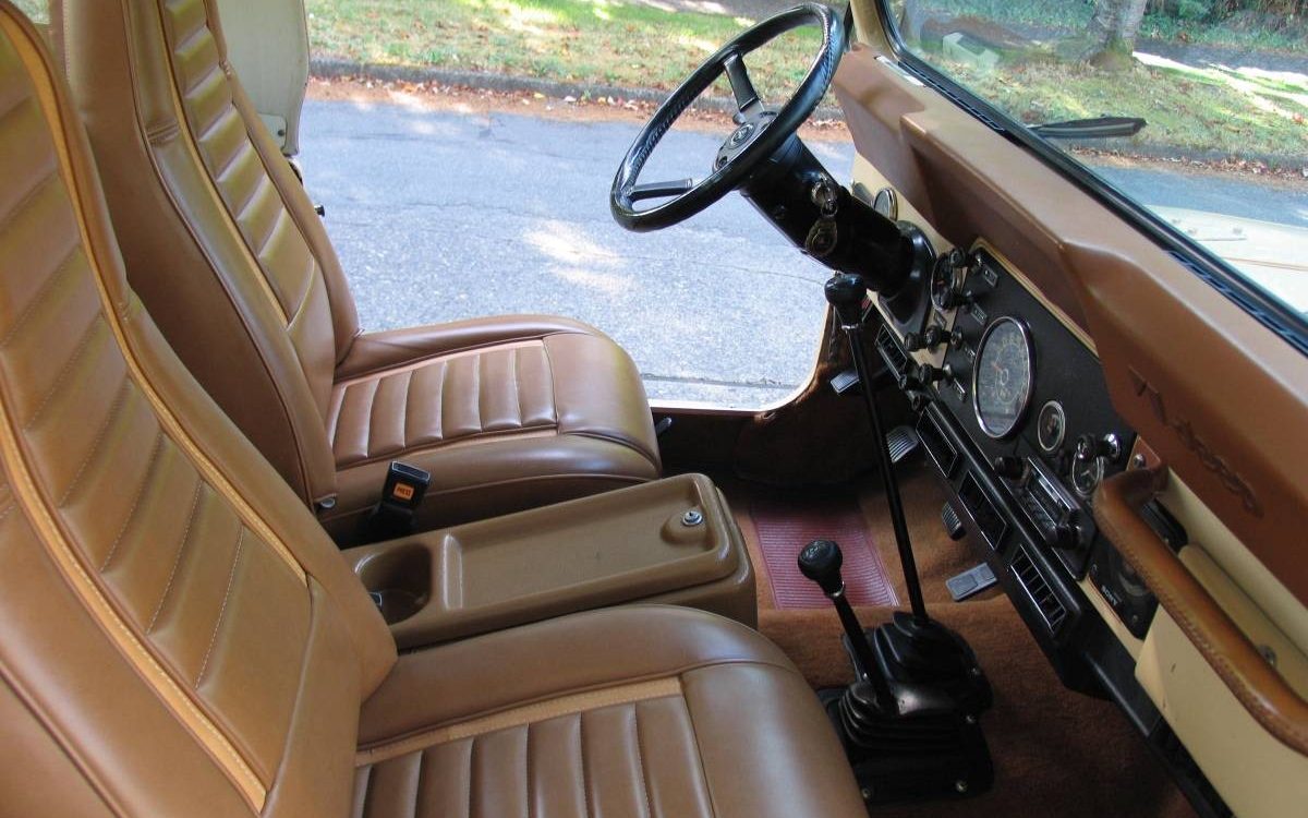 By older Jeep CJ series, the interior of this Scrambler is downright luxurious – well maybe that’s a bit of a stretch but it’s definitely not as spartan as some from this era and the environment here doesn’t show signs of some serious doorless mud-bogging – it’s quite clean. This baby’s even carpeted and the cut-pile floor covering shows little sign of enduring the rigors that CJs frequently experience.