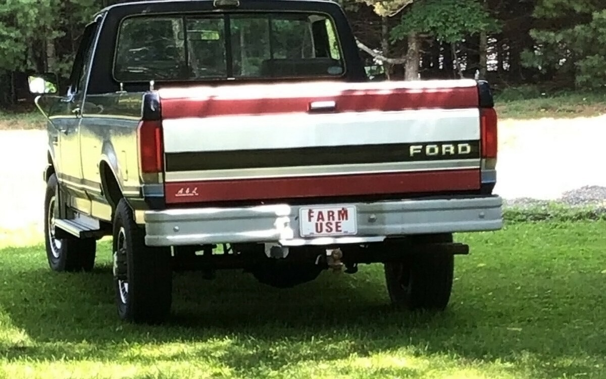 FARM USE. This doesn’t like what I think of when I think about a farm truck. This truck doesn’t look like it’s been used up and dinged and dented which is what I think of for a farm truck. As in, just being a piece of machinery to use, a pragmatic hauler or puller with not much time spent on keeping it looking nice because a nice looking pickup doesn’t pay the bills, a hard-working pickup pays the bills. There isn’t any mention of why it has a red tailgate which is a little unusual, and there are no photos of the inside of the bed, but the seller says that it has the original bedliner.