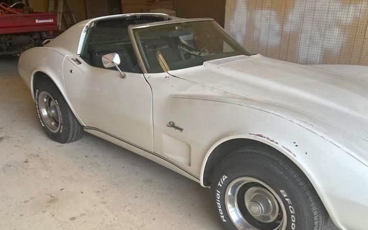 The code 910 Classic White paint has seen better days and there are no pictures of the undercarriage of the Corvette. There appears to be some fiberglass damage in places but overall the car just looks dirty and uncared for as it sits in the garage. Based on the different angles, this appears to be an old tired Corvette that somebody started to restore and, at some point, the work stopped and the car got set aside. Tell me if you see something different.