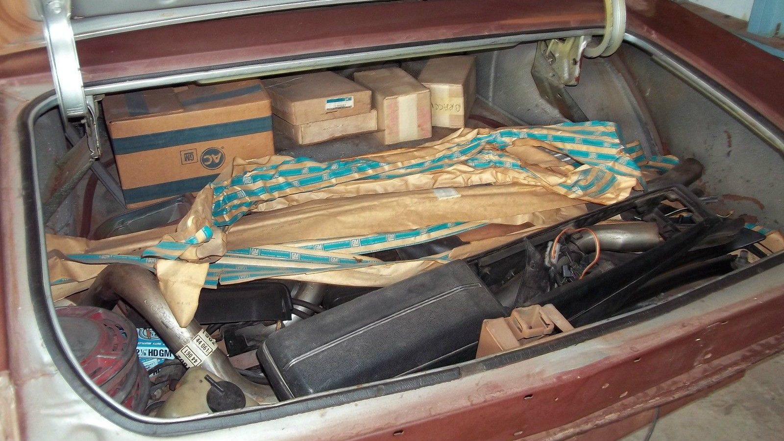 Here’s some of the trim and other parts stashed in the trunk. The seller drove the car as their daily for about four years, then pulled it off the road. The engine was “refreshed” but now has not been started in over 25 years. The seller does mention adding a tilt wheel for comfort, but the rest of the car is said to be stock.