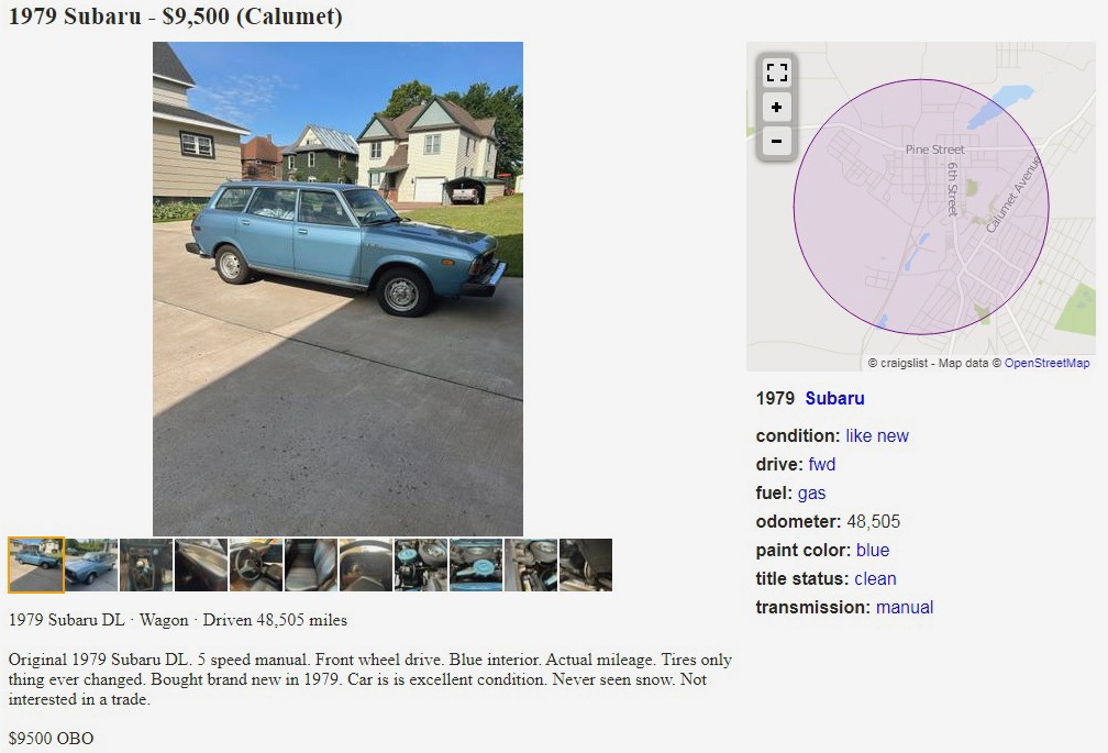 Talk about preservation, wow! This car won’t turn the crank for too many Barn Finds readers since it isn’t an American muscle car or a pickup, but for those of us who like unusual vehicles, this rust-free 5-speed 1979 Subaru DL Wagon is a gem. The seller has it posted here on craigslist in Calumet, Michigan, and the seller is asking $9,500. Here is the original listing, and thanks to Tony P. for the tip!