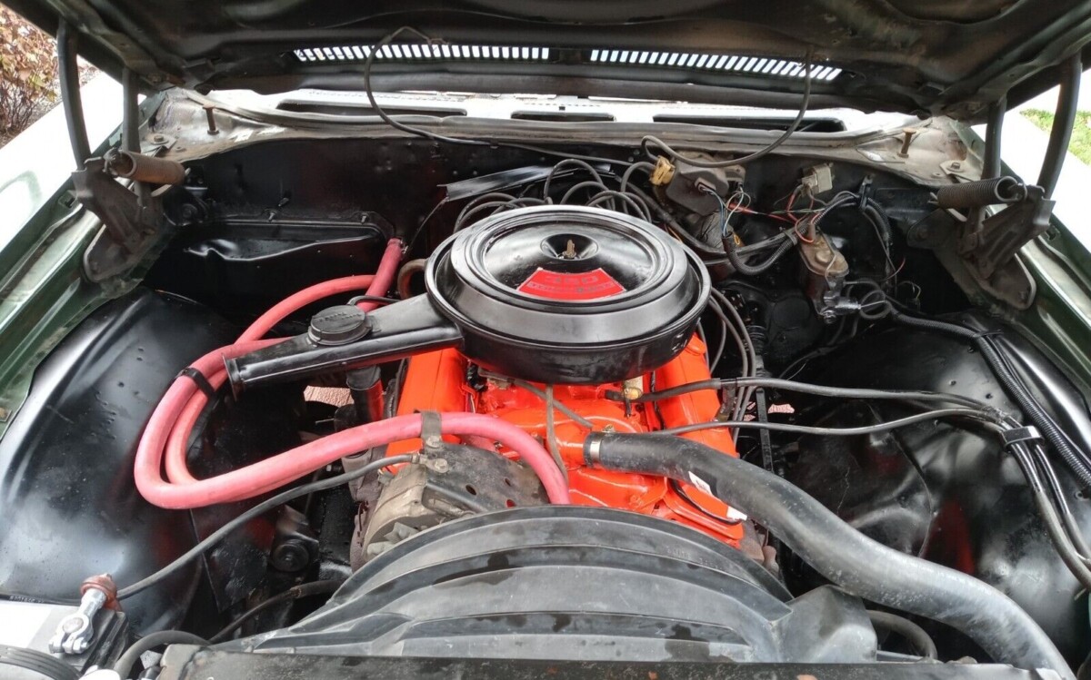 Indications are this is a two-owner car including the seller. It looks nice although you’ll find some imperfections in the finish on close inspection. There doesn’t appear to be any rust on the Chevy, past or present. The vinyl top contrasts with the dark green paint and matches the all-vinyl interior which also presents well. The seller has a spare vinyl top covering should you ever need it.