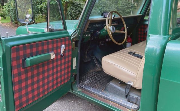 It just keeps getting better and better. The Paul Bunyan plaid door panels and headliner would absolutely stay under my watch. I’d want to maybe think of a different seat color, but I’m guessing a tan interior, which International referred to as Sage, was what came with the original Frost Green paint. You can see that the steering wheel and padded dash top are matching. The seller says that $4,000 has been spent on this truck recently, and it has an AAMCO transmission, or I think that’s what they mean. Maybe the original three-speed automatic was rebuilt by AAMCO. This is a rear-wheel drive pickup, by the way, not a 4×4. At least according to the VIN decoder I did find online. It sure looks like a 4WD, doesn’t it? Those hubs… this is a confusing one.