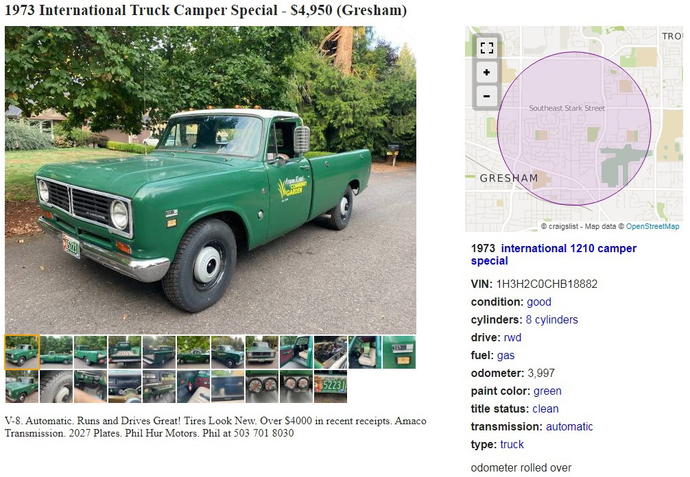 Sometimes, a used vehicle can be too inexpensive, and it makes me scratch my head, wondering if it’s real or not. This is one of those cases. This 1973 International 1210 Camper Special is posted here on craigslist in Gresham, Oregon, and they’re asking a mere $4,950, and it’s said to have had $4,000 in recent work. Here is the original listing, and thanks to Curvette for the tip!