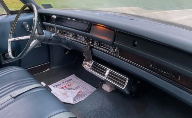 As the story goes, the seller bought this Bonneville recently off the original owner, who had moved into a rest home. We’re told you’ll find nary a hint of rust, and the white paint is original (though we wonder about touch-up in places like the door jambs). The car may never have ventured out in the Winter, thus preventing rock salt from being a factor. This vehicle’s matching top and blue interior also present quite well (though the canvas may be a bit dirty).