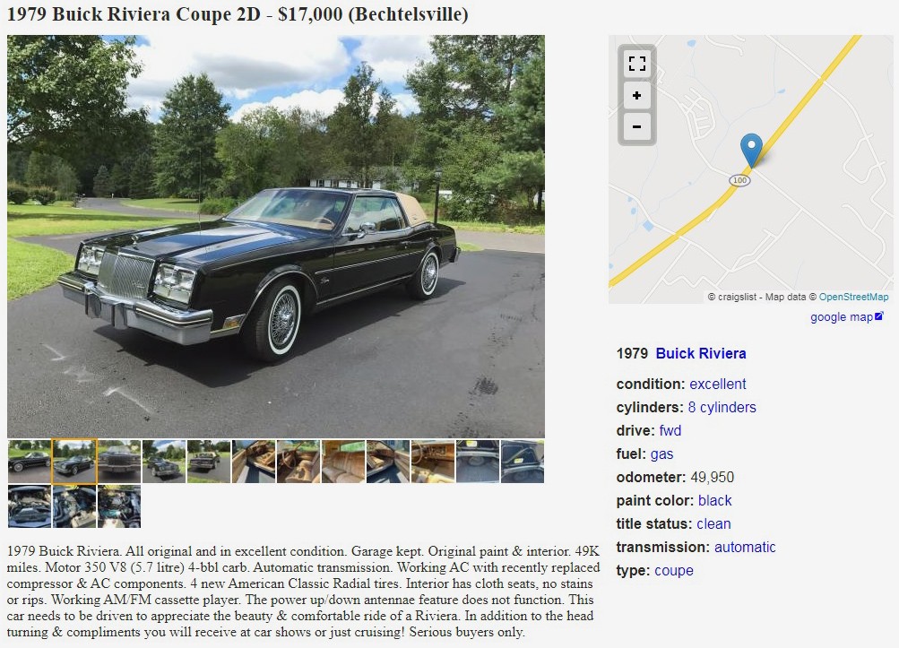 A major design homerun for GM, in my opinion, the sixth-generation Riviera was one of the company’s most elegant cars in this era. The sloping grille and front end makes the car look like it’s moving even when it isn’t, and the sweeping rear quarters give it a graceful yet muscular look. The seller has this 1979 Buick Riviera posted here on craigslist in Bechtelsville, Pennsylvania, and they’re asking $17,000. Here is the original listing, and thanks to Mitchell G. for the tip!
