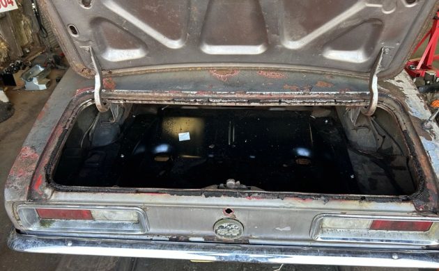 The seller notes that the trunk pan has already been replaced. The driver-side floor pan still needs replacement, and both rear quarter panels will require attention. Despite those needs, the inner structure and shock towers are described as being in great condition, which is an encouraging sign for a car that will need comprehensive restoration work.