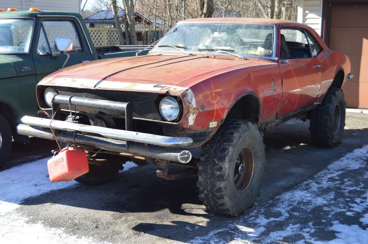 We’re told the transformation to a Jeeparo began in 1980. The Camaro saw a lot of bad winter weather and the undercarriage was no good, so a previous owner took the rusty body and sat it on top of the Jeep Wagoneer chassis (vintage 1968 to 70). It was a daily driver for many years before being parked in a garage in 1991. But the owner must have had a lot of fun with it, hitting mud bogs down in West Virginia. The Jeep chassis is stock except for the addition of Ford F-250 rear springs, adding further confusion to the car’s identity problem.