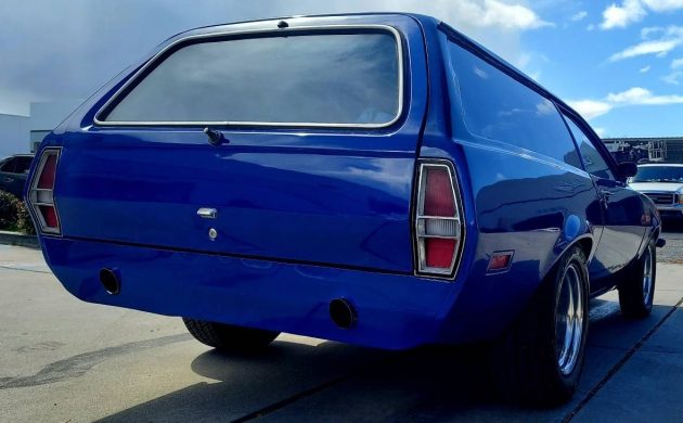 There’s no information about what kind of condition the body was in before it was painted, but it definitely looks good now, and I wouldn’t be surprised if this one’s been in the California area for quite some time. The rear panel with the dual exhaust coming through is eye-catching, with the big-and-little wheels and tires also an indication that this wagon means business. However, if this one leaves the Golden State area, it would probably be wise to put the windshield wipers back on.