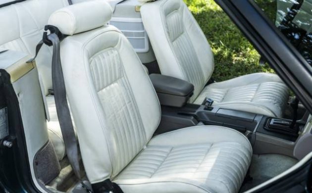 I believe this is what we’d call Deep Emerald Green, which is a very pretty color and a reminder of my previous diatribe of how popular green used to be (it’s now enjoying its second act, as green regains its footing as a desirable color.) The Fox body Mustang was also available in an equally memorable shade known as Calypso Green, which is possibly harder to find and even more striking in person. Right out of the gate, the paint is helping this Mustang stand out compared to the typical reds and blacks, and if it loses the window tint shown in the first photo, it’d look even better. The white top and boot appear to be in good condition, and mesh nicely with the white leather interior.
