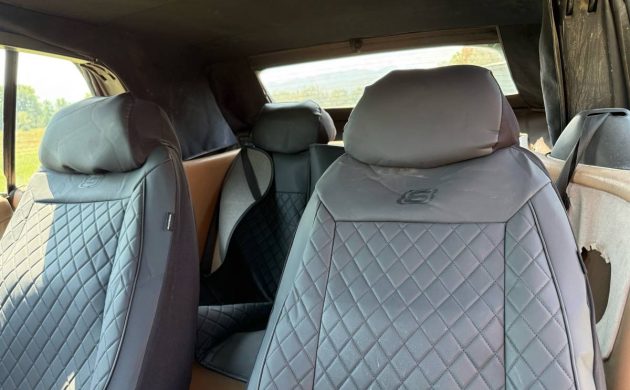 The “new high-quality waterproof” seat covers look kind of cheap, and they’re covering rips and tears. When someone (especially in Colorado) says they “don’t know” if the seat heaters work, they don’t. The glovebox cover is falling off. The radio doesn’t work (and the speakers are beat), interior is peeling all over, and the whole effect “lacks grace.” The rubber floor mats are new, though.