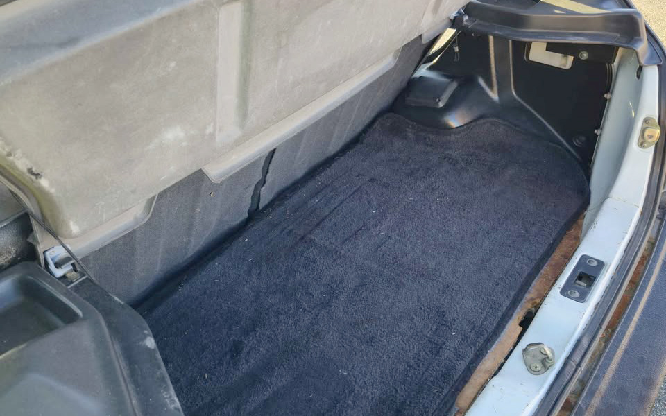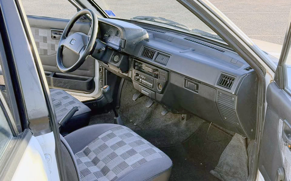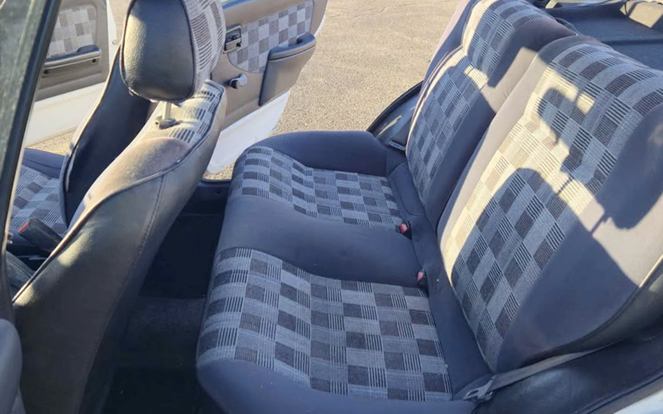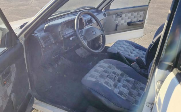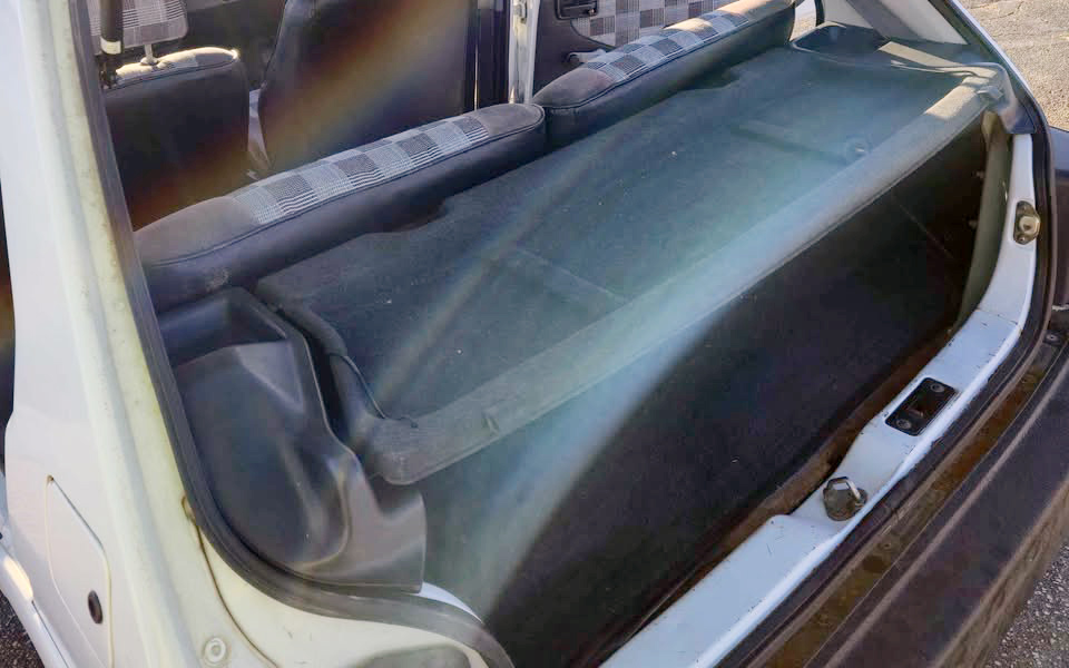 It’s a very rare Justy interior that’s in mint condition, and this one is no exception. The driver’s seat fabric is pretty well worn and starting to fail. It’ll be hard to find that exact fabric to redo that seat. Luckily, the other seating surfaces look good, both front and rear. The rear cargo cover is as rare as it gets, so it’s nice to see that in place here, and it hides a small rear cargo area that looks clean.