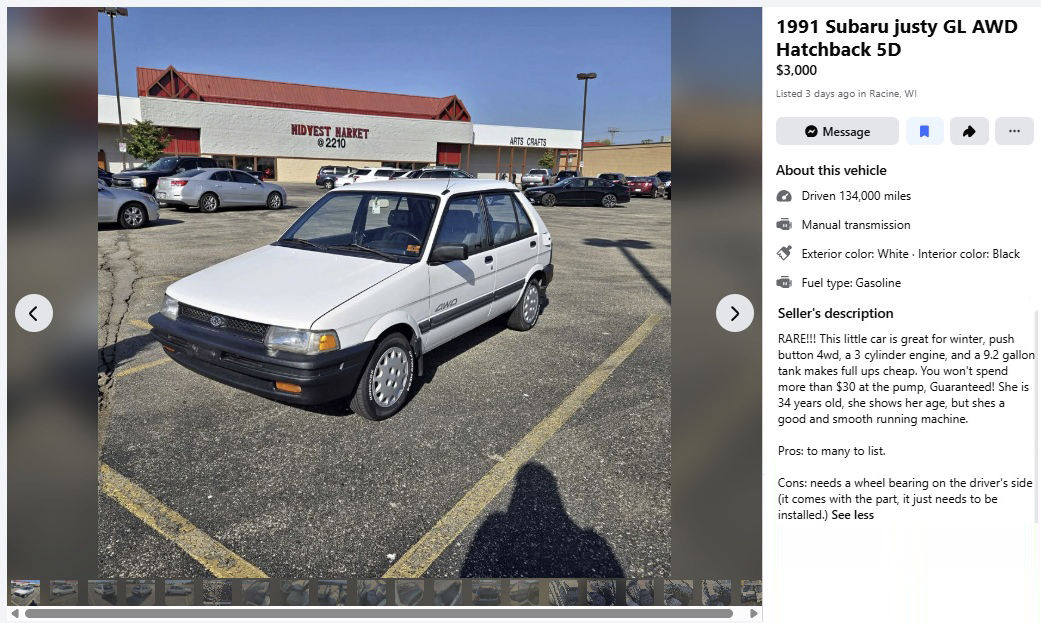 We’ve only seen eight examples of the Subaru Justy here on Barn Finds over the years, and only one other four-door sedan. They’re known rusters, but this example looks great, despite a few dings here and there. The seller has this 1991 Subaru Justy GL 4WD sedan listed here on Facebook Marketplace in Racine, Wisconsin, and they’re asking $3,000. Here is the original listing.