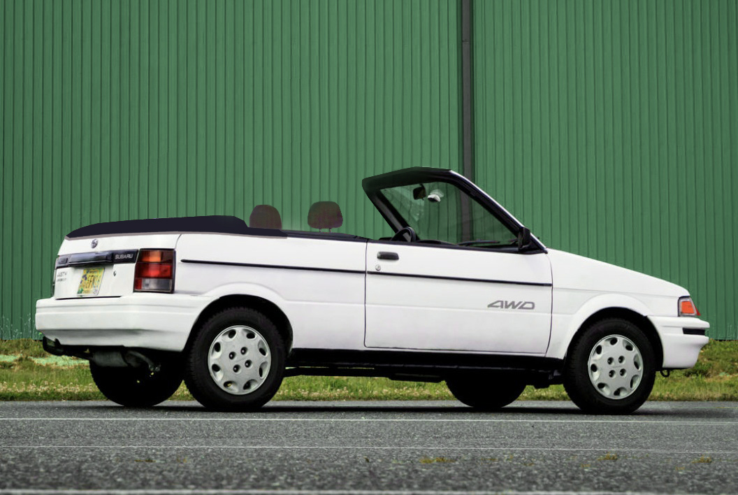 The Subaru Justy was made, for the first go-round, from 1984 through 1994, and we got them in the U.S. from 1987 through ’94. There were five white colors between ’87 and ’94, but they were all basically the same. This one is called Ceramic White. The Justy came in a two-door and four-door, as seen here. There wasn’t a convertible, at least until I made one just now. They were either front-wheel drive or with a push-button-activated 4WD system.