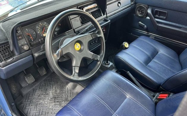So what’s the Ferrari thing about? It’s a Volvo, for gosh sakes. But it turns out these are said to be actual Ferrari wheels from a 308, mounted with Cooper tires. Still….Other features include a lowered stance, front spoiler, LED headlights, and black mirror caps and window trim. Any rust in the lower extremities of the Volvo was cut out, and replacement metal welded in. There is current rust on the lower windshield trim and tailgate.