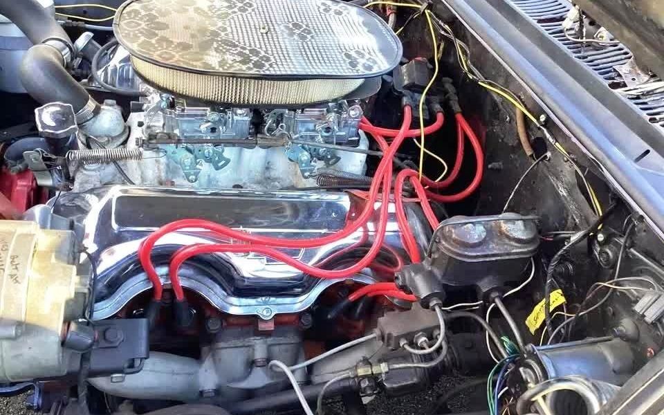 True to the Beach Boys’ classic “409,” this Chevy wears dual-quad (twin four-barrel) induction, a four-speed manual gearbox, and a 4.56:1 Positraction rear end. Check out that video link to see how a built 409 twists up the big Chevy on a hard launch. At least this one’s comically tiny tires will act as a “clutch” to protect it from the angry mill’s metal-twisting torque.