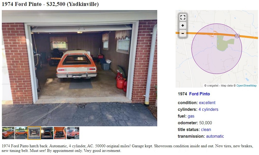 We’ve seen low-mile Pintos, some with a fraction of 50,000 miles. Some were very nice original cars, and some were even restored cars. Some were early cars with much nicer, small bumpers. Some were wagons, even a nice woodgrain Squire wagon or a later Cruising Wagon, but I don’t know if any of them have been over $30,000, were they? I’m not saying this “showroom condition inside and out” Pinto isn’t worth the asking price; that’s up to the seller to set the price.