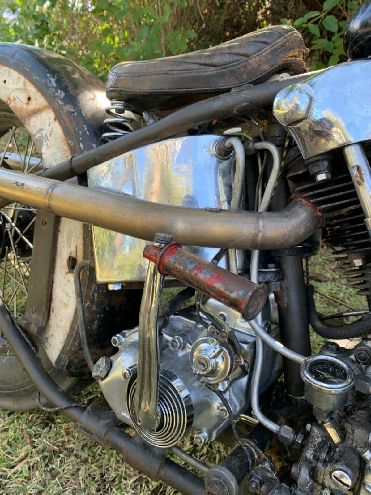 It would seem that the parts for this 1950s Chopper parts have been drawn from many different Harley models. The frame is of 1938 vintage, with all of the markings and casting codes clearly legible. The frame itself is in very nice condition, with no signs of any bends or fatigue in the tubes. The rear fender is also of 1938 vintage and might be original to the frame. The chrome oil tank is a 1939 model, but the vintage of the 3½ gallon fuel tank isn’t clear. That tank wears a few dings and dents, but it could certainly be repaired or restored. However, I suspect that more than a few potential owners would choose to leave it as-is, and ride the bike as a true survivor.