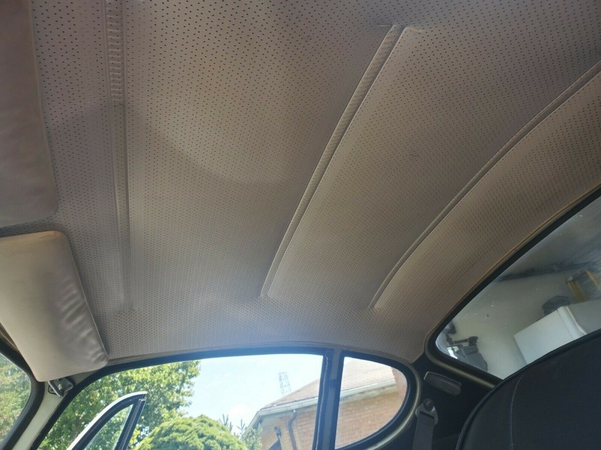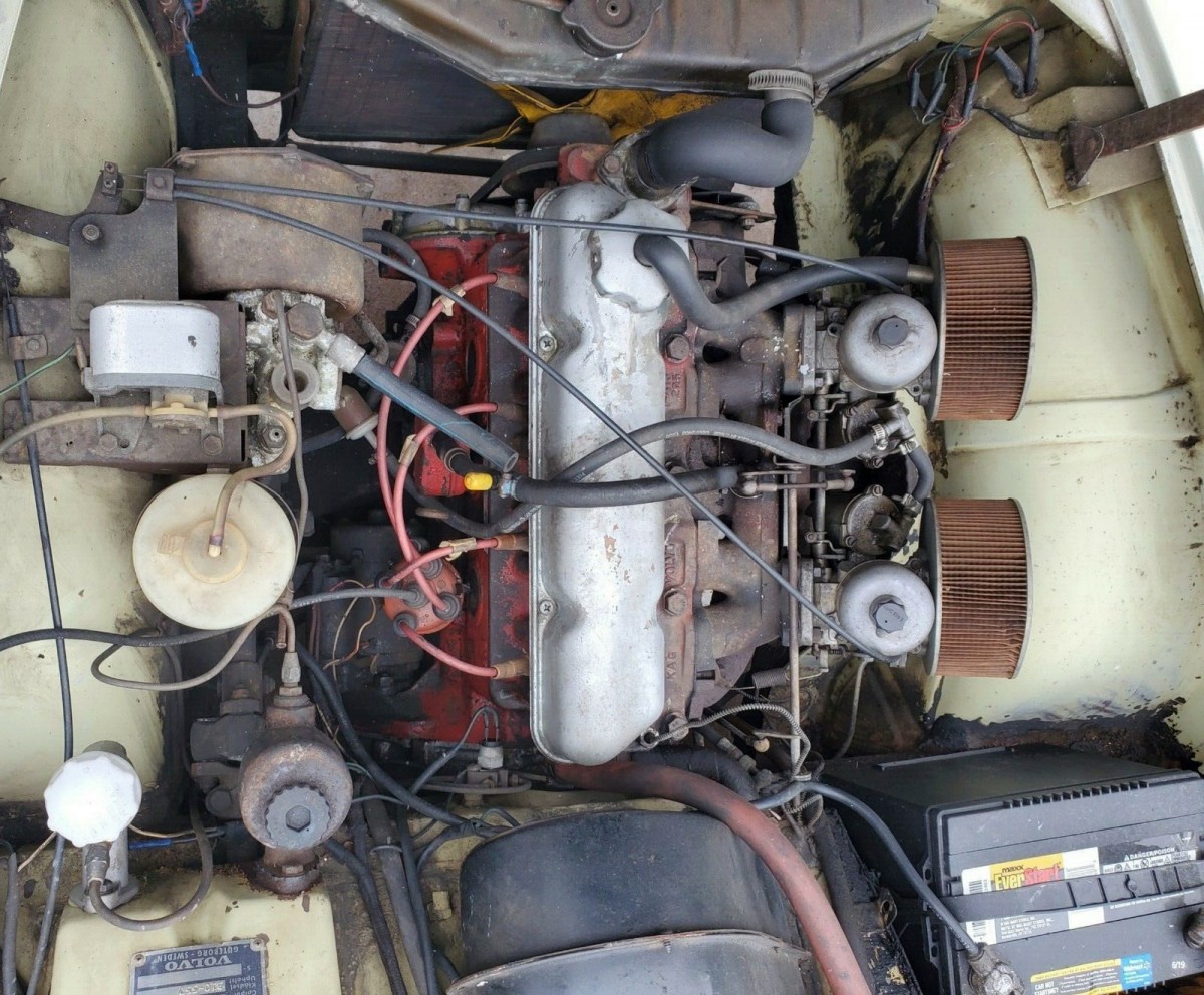 The back seat is original, with what maybe a pair of minor cuts, and the original leather straps are still in place. The headliner looks original and perfect. A rarity is a vinyl-covered dashboard without any rips or splits. All the instruments are there, though being Lucas units it would be a miracle if they all worked. The door panels, with their embossed “Volvo” logos, have an extra hole or two but are mostly there. The spare tire cover is still in place, as is the original plastic-wrapped racing-type steering wheel.