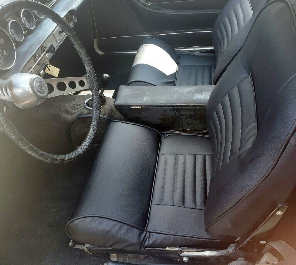 The engine bay looks complete but fairly grubby. It’s not a Concours example. The interior is encouraging. What could be the original seats (should be leather) are intact. They may be vinyl, following the original pattern. The center console appears to have been exposed to water at some point, and may still be visited by mildew.